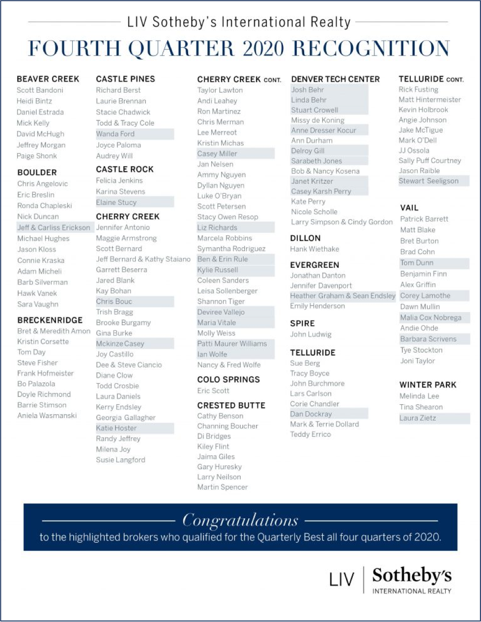 Jeff Bernard and Kathy Staiano in the Cherry Creek office are 4th Quarter Top Producers.